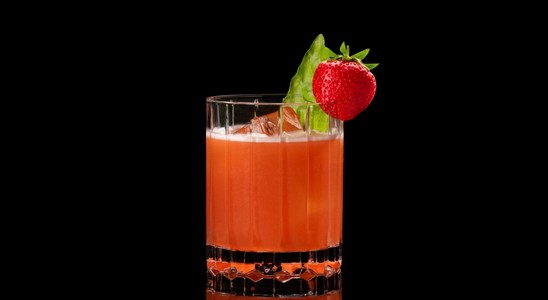 Garnish with strawberry and basil leaf.